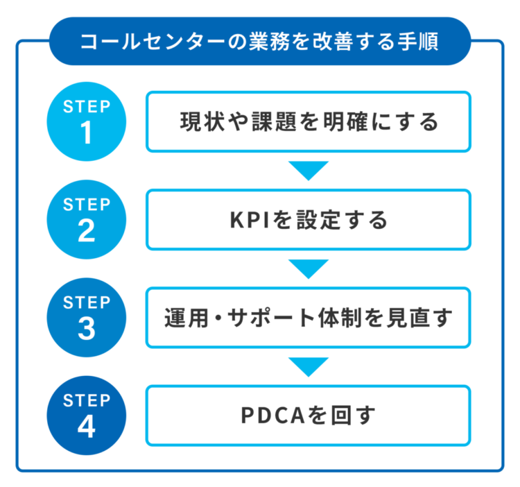コールセンターの業務を改善するには、以下に挙げる4ステップを踏む必要があります。それぞれのステップについて解説します。